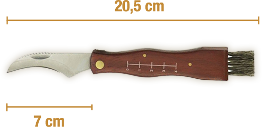 Praktické funkcie: Nôž je vybavený zasúvacou čepeľou, ktorá sa dá ľahko a bezpečne otvoriť a zatvoriť. Súčasťou noža je aj meter na meranie dĺžky húb a kefka na ich čistenie.