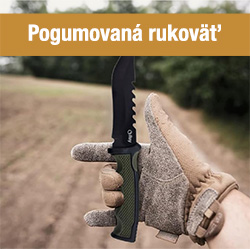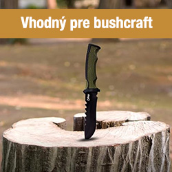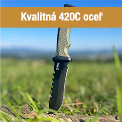 Univerzálny kempingový nôž: Nôž má pogumovanú a tvarovanú rukoväť pre lepšiu priľnavosť prstov a kontrolu pri rezaní. Je vhodný aj na taktické použitie. Chrbtom čepele môžete škrtnúť o flintu a vytvoriť iskry na založenie ohňa.