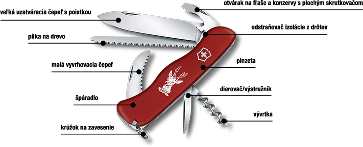 Funkcie | Veľká uzatváracia čepeľ, vývrtka, pílka na drevo, vyvrhovacia čepeľ, otvárak na fľaše, otvárak na konzervy, skrutkovač, odstraňovač izolácie drôtov, dierovač/výstružník, nerezový krúžok na kľúče, pinzeta, špáradlo |
