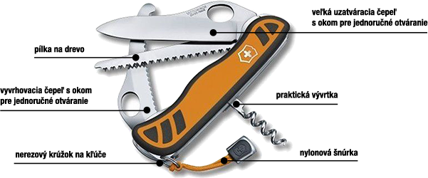 Funkcie | Veľká uzatváracia čepeľ, vývrtka, nerezový krúžok na kľúče, vyvrhovacia čepeľ, pílka na drevo, nylonová šnúrka |