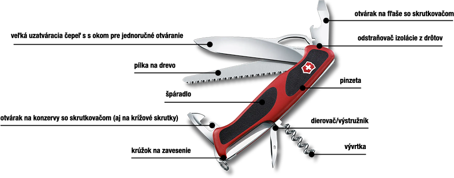Funkcie | veľká uzatváracia čepeľ, otvárak na konzervy, malý skrutkovač (aj na krížové skrutky), otvárak na fľaše so skrutkovačom, odstraňovač izolácie drôtov, pílka na drevo, dierovač/výstružník, vývrtka, nerezový krúžok na kľúče, pinzeta, špáradlo |